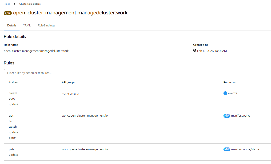 When I discover that the managed cluster have flow to the hub cluster, I look at the available permissions: