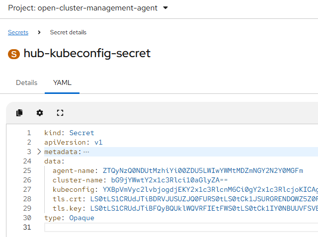 $ oc get secret hub-kubeconfig-secret -n open-cluster-management-agent -o jsonpath="{.data.kubeconfig}" | base64 -d > kubeconfig.yaml