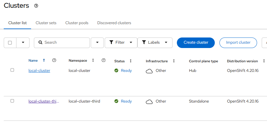 I have a hub cluster named "local-cluster" and a managed cluster named "local-cluster-third".